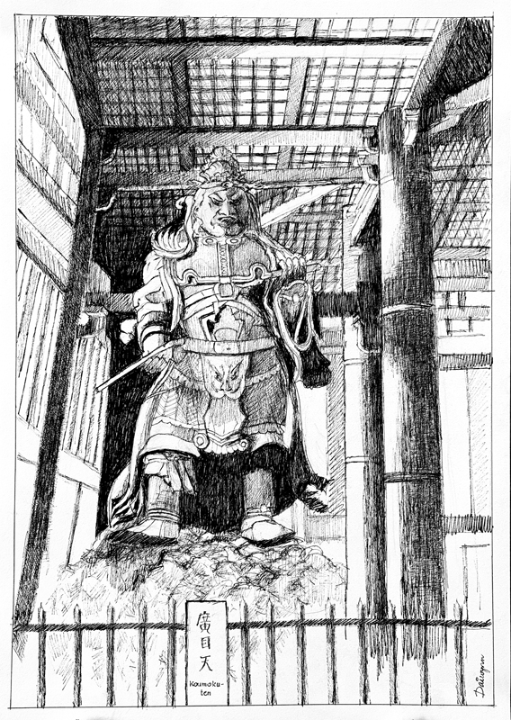 Koumokuten Statue in Nara, Japan. Koumokuten, one of the Shiten’oo (Four Heavenly Kings), the guardian of the West, at Todaiji temple in Nara, Japan. While this is a freehand black ink sketch on white paper, the actual statue has gold decoration and stands surrounded by red coloured wood. This is one of two “minor” statues beside the enormous Buddha in one of the largest wooden buildings in the world.