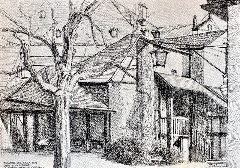 Freehand pen and ink sketch of the Theater der Schatten (Shadow Theatre) in Bamberg in Germany. Bamberg sits on the Main River which links the Danube and Rhine. The Theater is part of the Alte Hofhaltung (Old Court). While wandering across the bridges at the Alt Rathaus (Old Town Hall) in the old part of Bamberg, one marvels at the beautifully coloured murals, and the ornate and lofty tower. Close by, terracotta shingles and tiles cover an amazing roof geometry of this old stone and wood building. Ink on 300 gsm medium Arches paper. 21 cm high by 29.7 cm wide by 0.1 cm deep approximately. A4 standard size.
