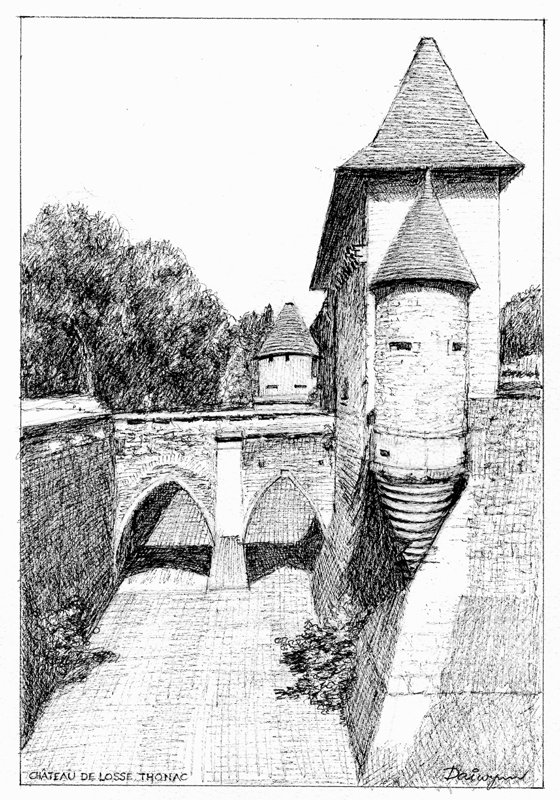 Dai Wynn has sketched the Château de Losse in ink on French Arches paper. This beautifully restored castle sits over the bank of the Vézère River at Thonac. The Nouvelle Aquitaine department is in south central France. Drawn on 300gsm medium texture Arches cotton paper. 29.7 cm high by 21 cm wide by 0.1 cm deep approximately.