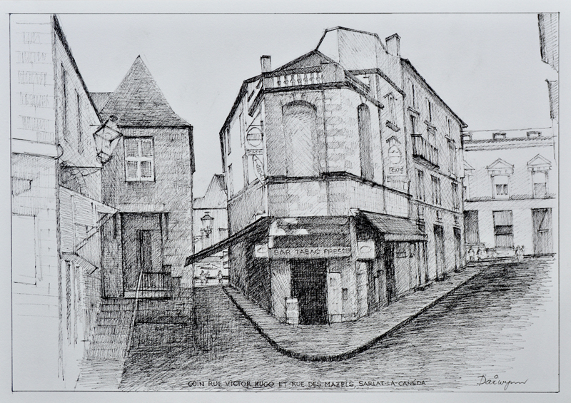Freehand ink sketch of the café on the corner of rue Victor Hugo and rue des Mazels, Sarlat-la-Canéda, France. As the sign on the awning says, “Bar, Tabac, Presse – Alcohol, Smokes and Newspapers”. Sarlat is the gateway to the Périgord Noir and the châteaux, fortresses, caves, and medieval villages along the Dordogne River. Sarlat is rightly famous for its old town centre, meticulously preserved and a bustling tourist hub. Dai Wynn drew this view from a photograph he took while staying in the town. The difficulty of removing camera lens distortion while retaining perspective is evident here. 29.7cm high by 42cm wide by 0.1cm deep approximately.
